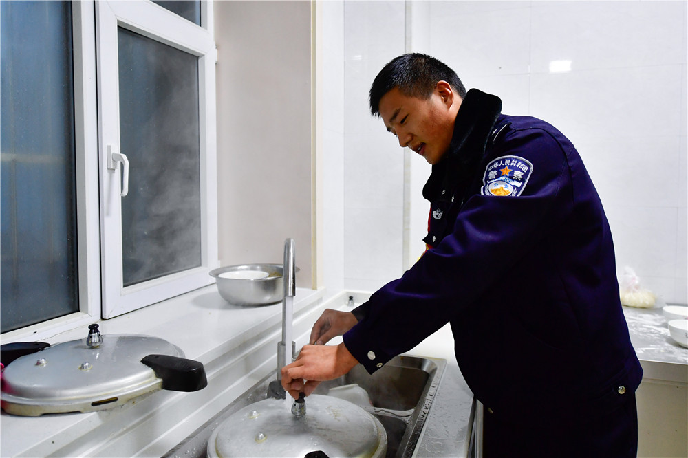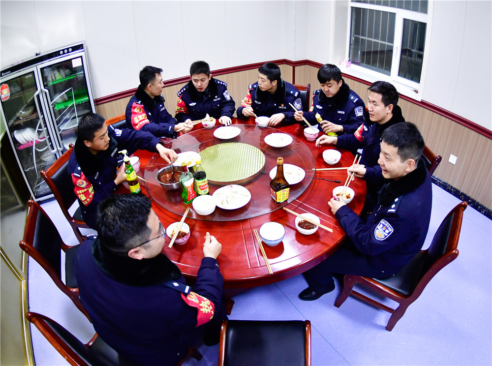 傍晚,室外温度达到了零下15摄氏度,寒风拍打着窗子呼呼作响。厨房里,民警们各司其职忙活张罗,升腾的热气中传来大家的欢笑声。
