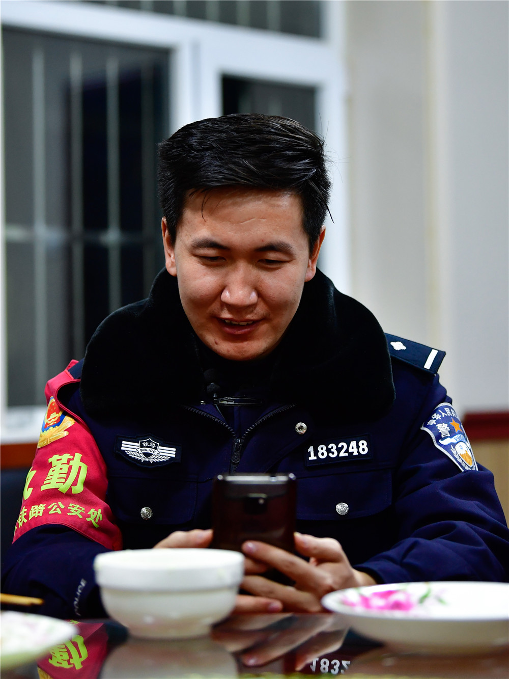 39岁的田长松在这里工作8年,目前是雁石坪警务区的民警,负责160公里铁路沿线的安保任务。小年夜,他专门驱车100公里来到派出所,和兄弟们一起过节。