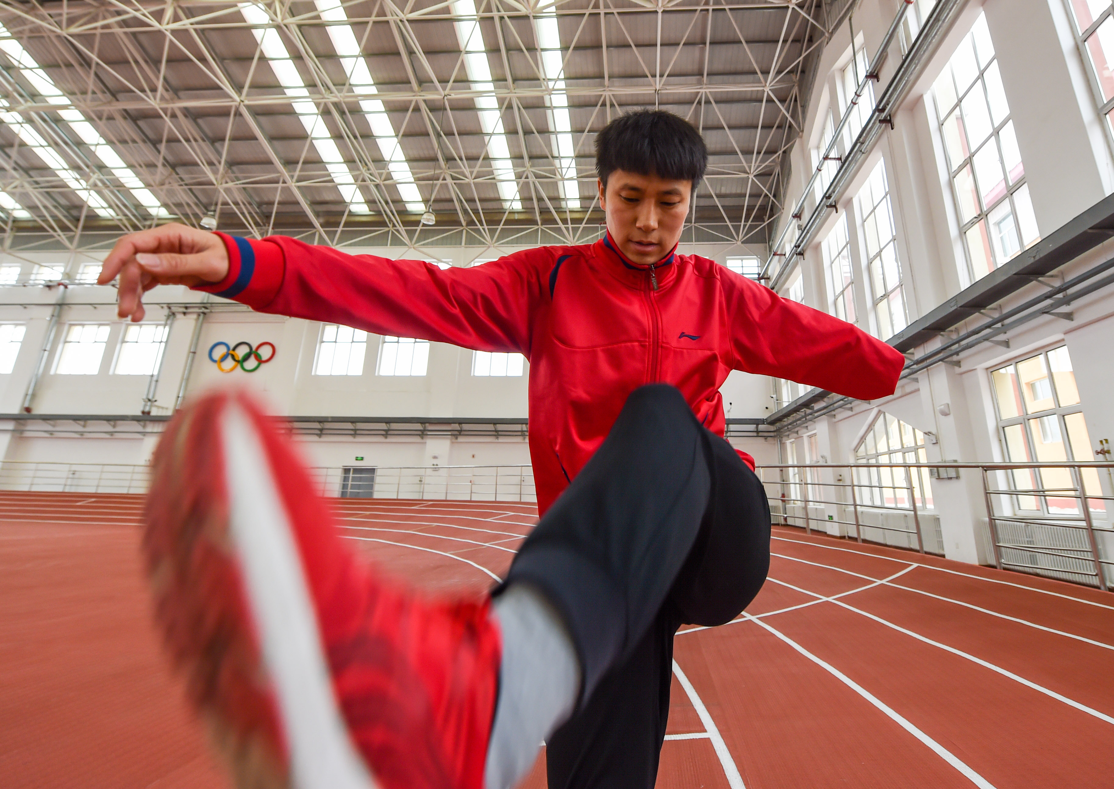 1月12日,赵强在内蒙古自治区体育局武川训练基地的体育馆内进行热身训练。新华社记者彭源摄