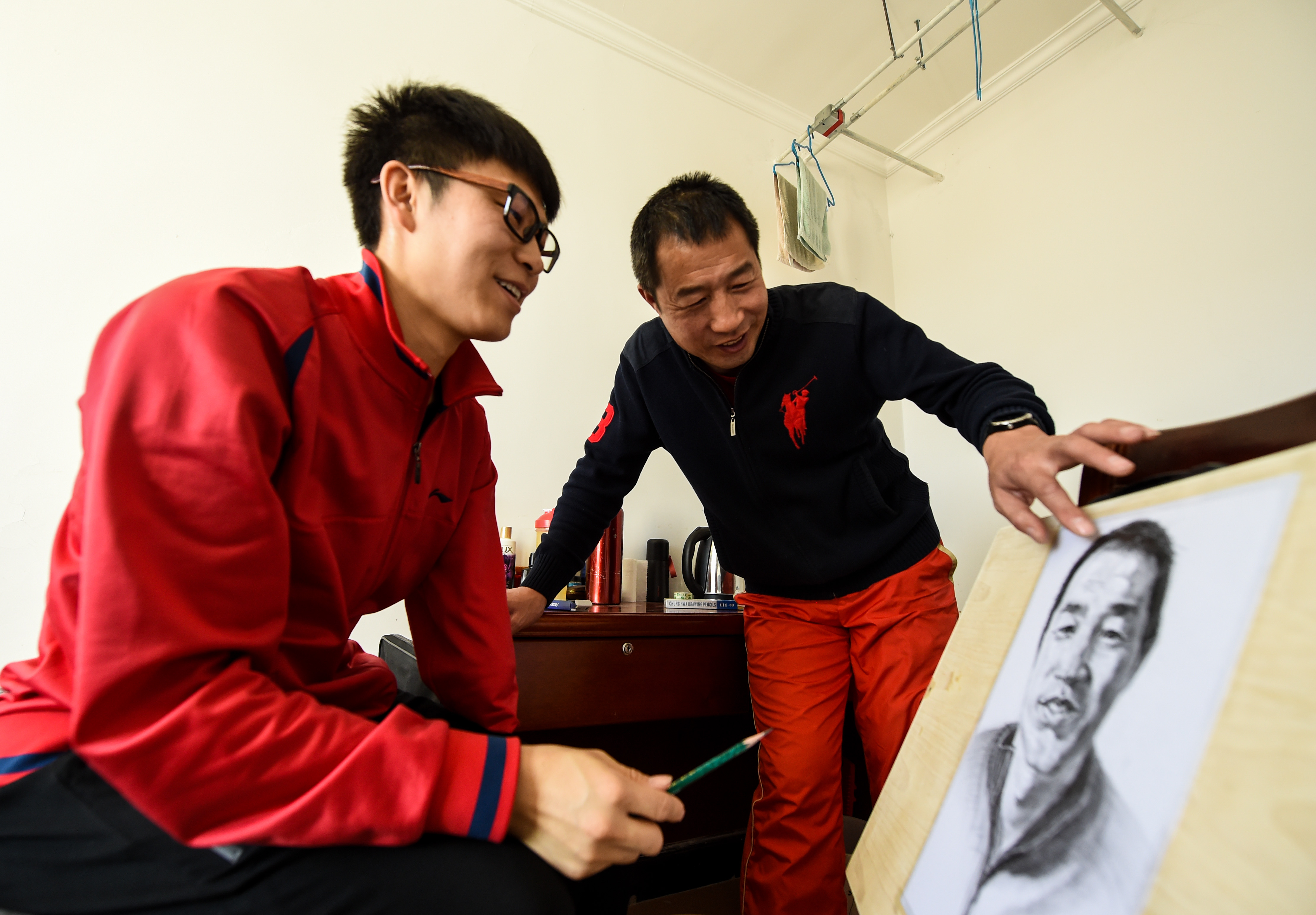 1月14日,闲暇时赵强(左)在宿舍内为陈福春教练(右)画像。新华社记者彭源摄