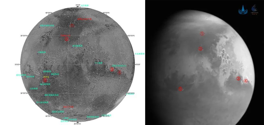 ①阿茜达利亚平原;②克律塞平原;③子午高原;④斯基亚帕雷利坑;⑤水手谷。