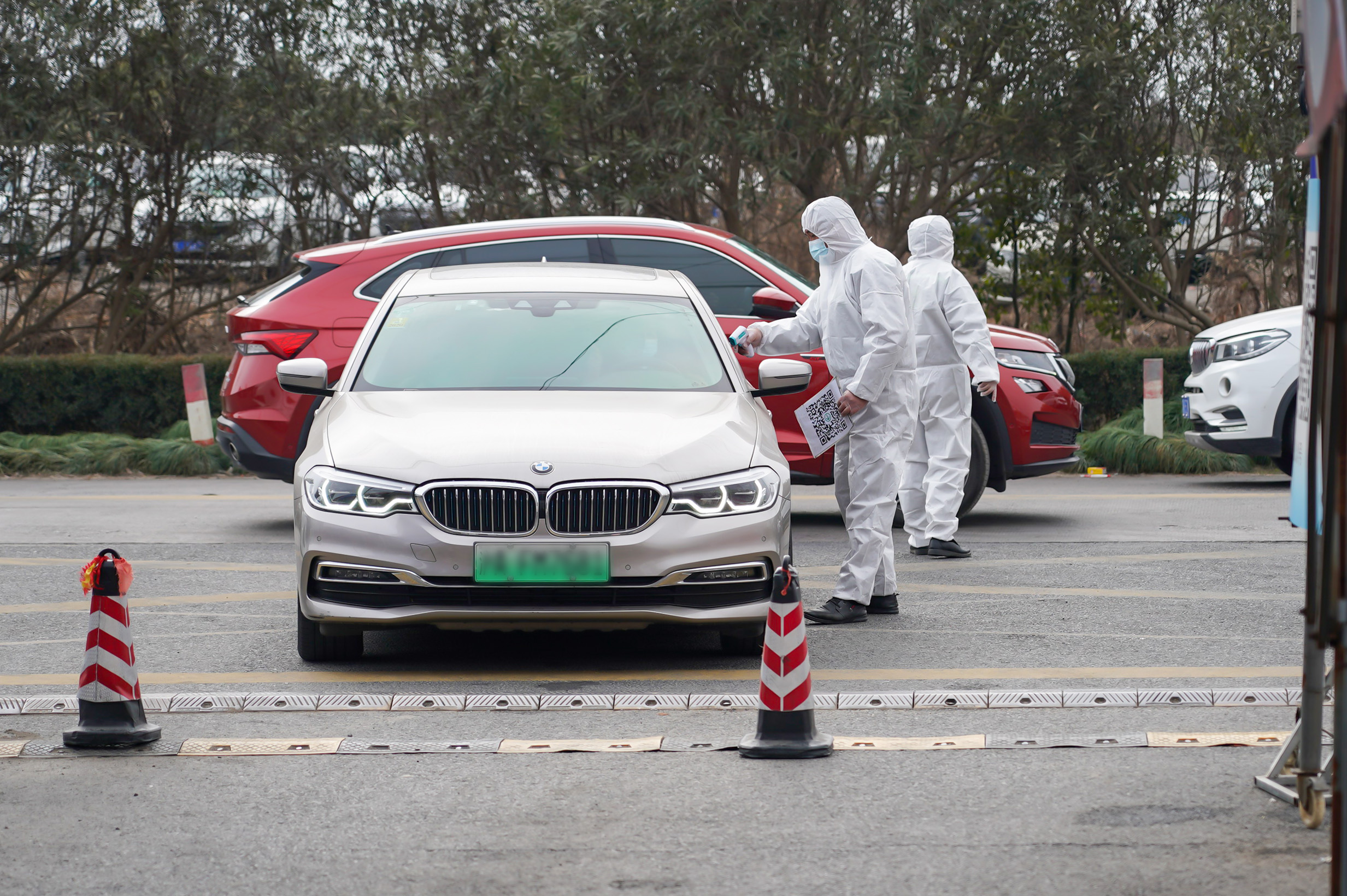 工作人员在上海辉展果蔬批发市场入口处对车辆内人员进行测温检查。新华社记者王翔 摄