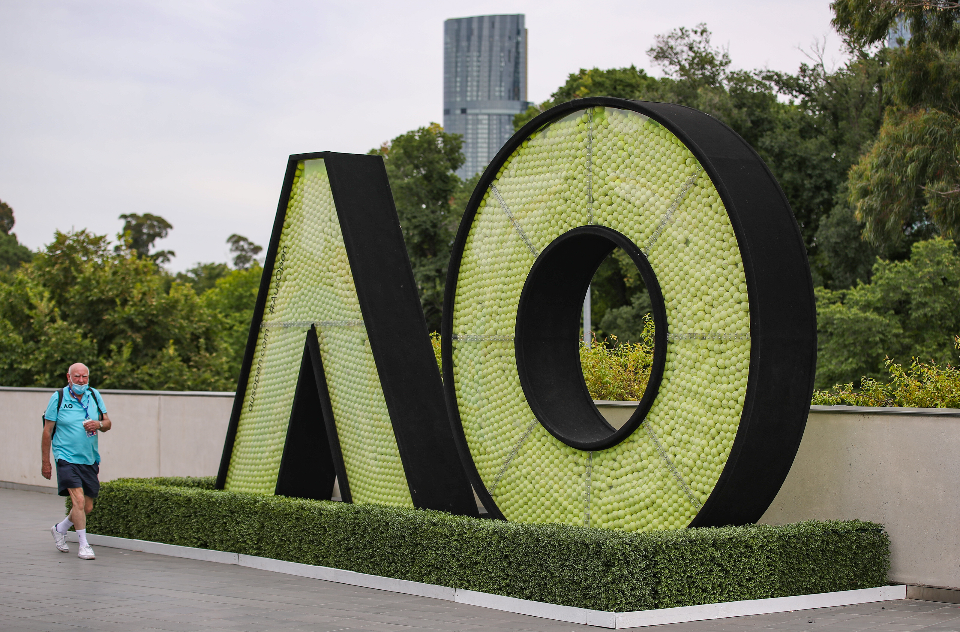 2月4日,在墨尔本公园球场,一位工作人员从2021年澳网签表前走过。新华社记者 白雪飞 摄