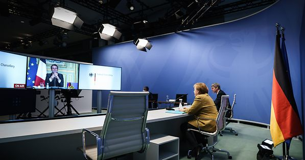 △默克尔(右)和马克龙在线上国防会议结束后召开联合新闻发布会