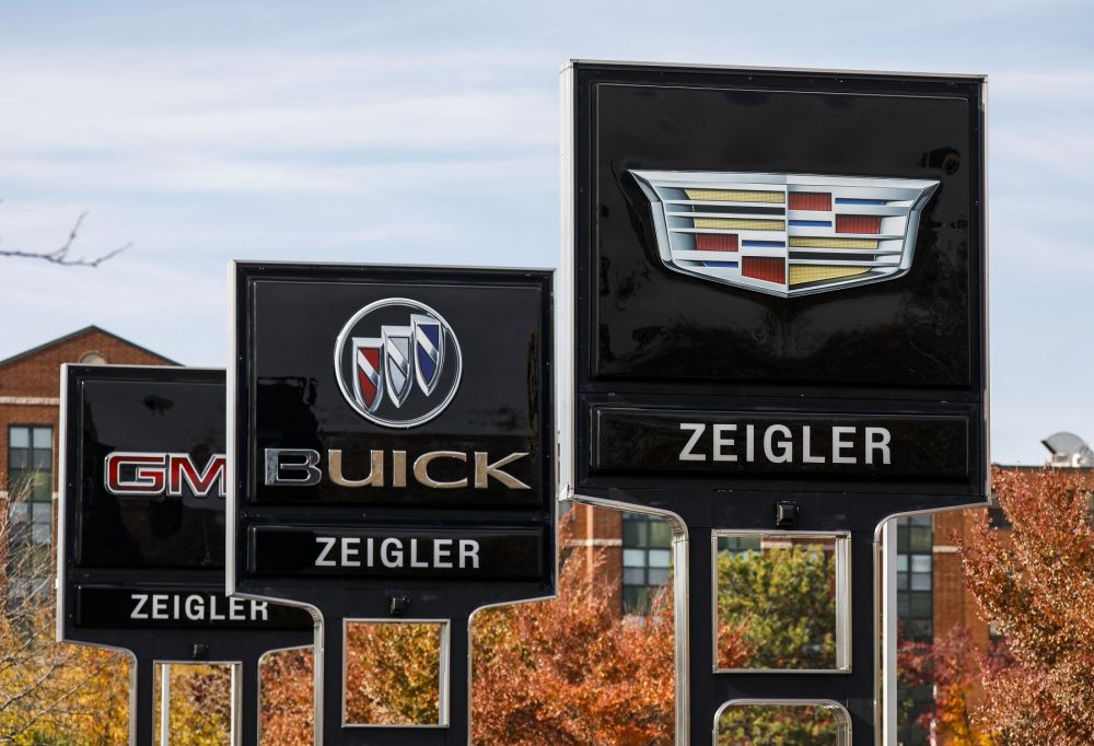 图为2020年11月5日在美国伊利诺伊州林肯伍德拍摄的通用汽车旗下凯迪拉克、别克和GMC的标牌。(新华社发,乔尔·莱纳摄)
