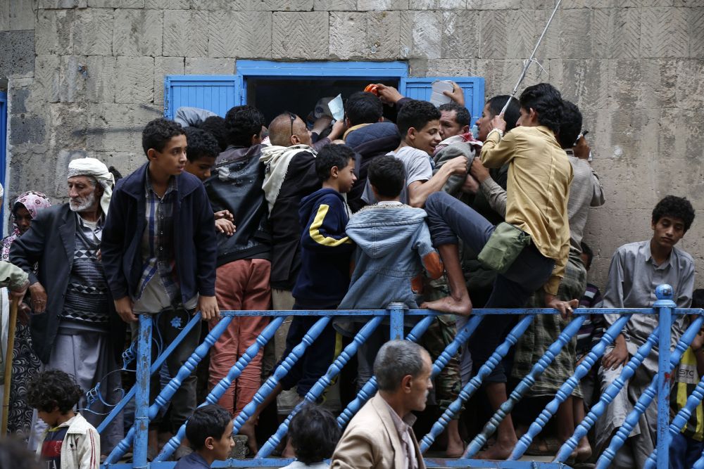 2020年4月27日,在也门首都萨那,人们在一处救济点领取面包。(新华社发)
