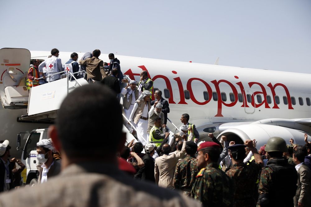 2020年10月15日,也门政府与胡塞武装开始大规模换俘行动,双方共计释放1081名战俘。图为获释的胡塞武装人员15日乘飞机抵达也门萨那。(新华社发)