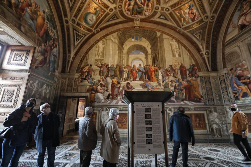 2月5日,人们戴着口罩在梵蒂冈博物馆欣赏拉斐尔的壁画作品《雅典学院》。