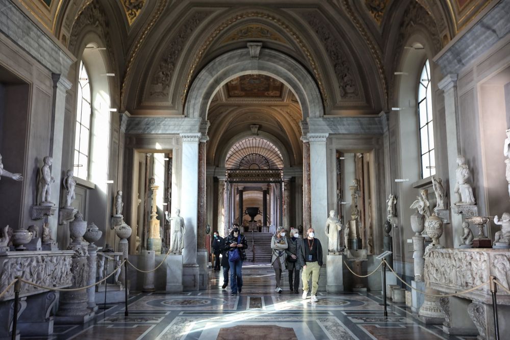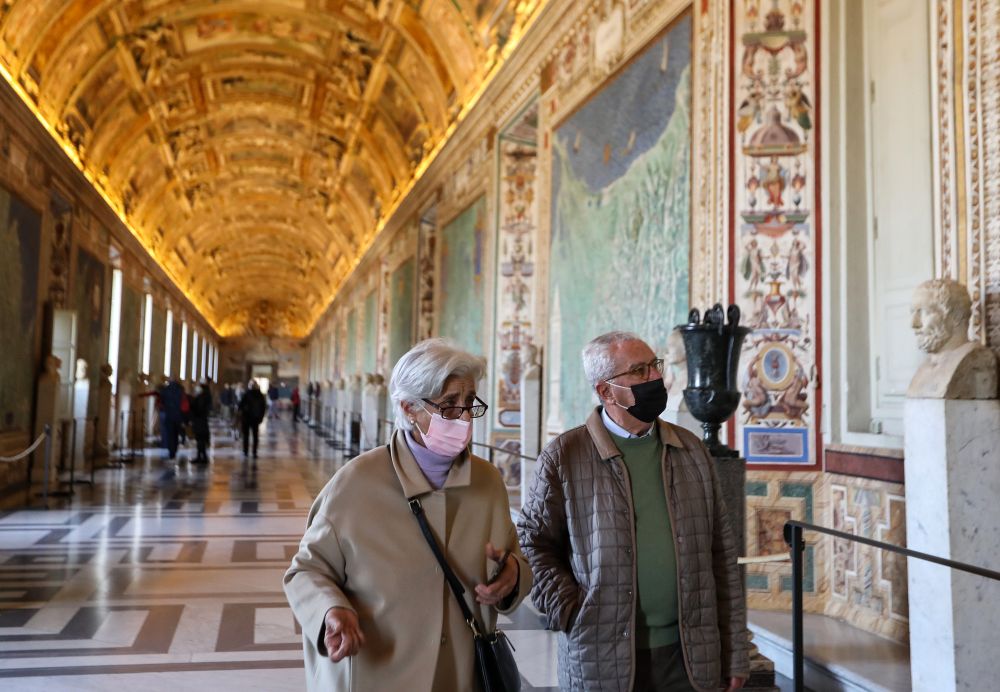 2月5日,参观者戴着口罩走在梵蒂冈博物馆内。