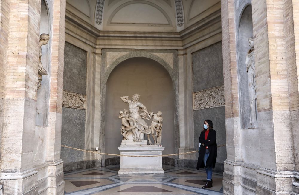 2月5日,在梵蒂冈博物馆内,一名女子戴着口罩欣赏《拉奥孔与儿子们》雕塑。