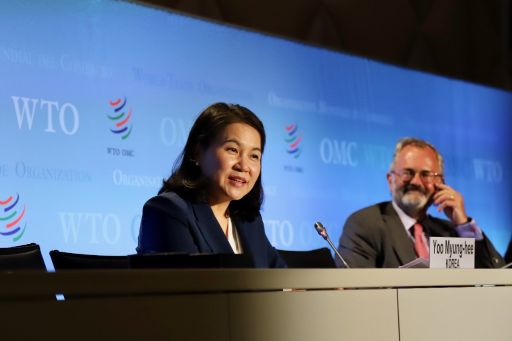2020年7月16日,韩国候选人俞明希(左)在位于瑞士日内瓦的世界贸易组织总部出席记者会。(新华社发,李叶摄)