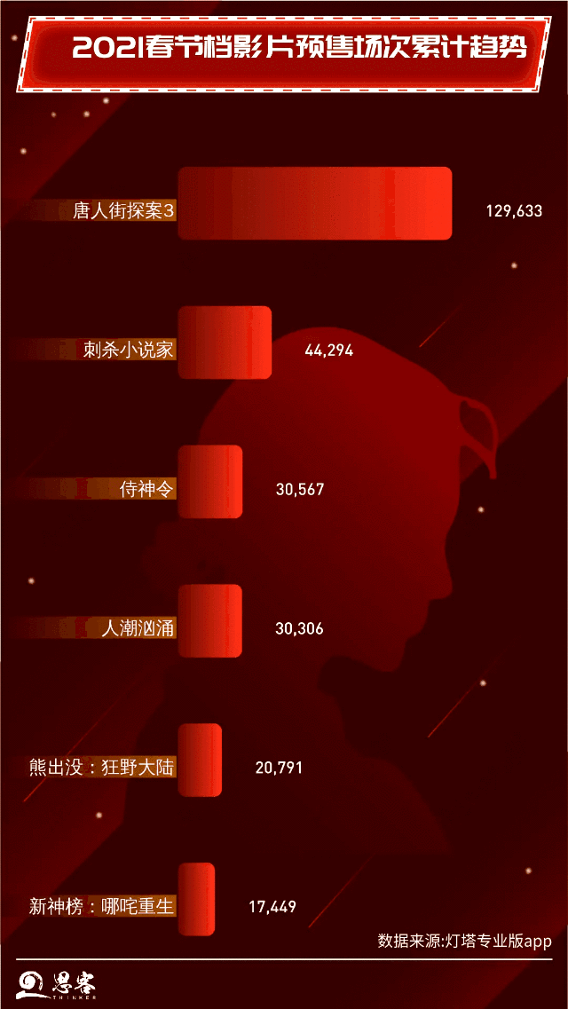 忧的是今年春节档第一梯队太过孤独,在之前的预测当中,《你好,李焕英》《刺杀小说家》都是处于第一梯队的,而从预售成绩看,这两部影片显然已经被挤进了第二梯队。按照往年春节档经验来看,这个档期最好有三部口碑不相上下的电影支撑,才能稳扎稳打稳赢,现在《唐人街探案3》成了独角兽,这给电影市场增添了一些不确定因素。