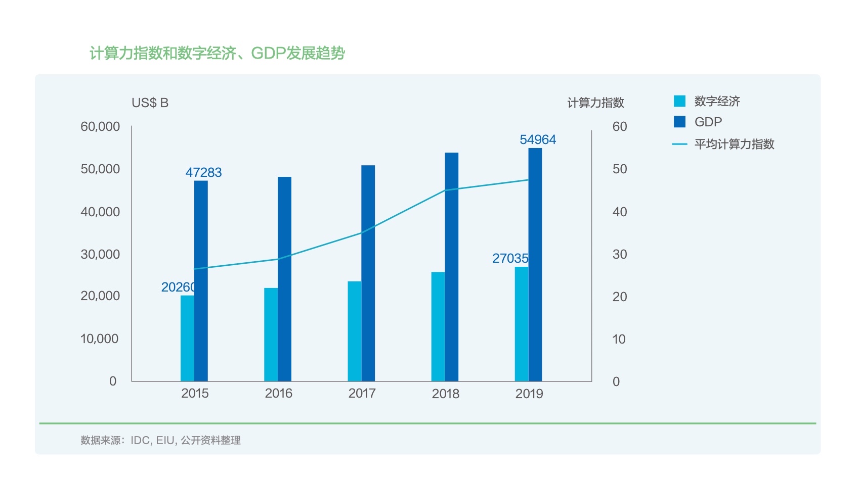 IDC中国助理副总裁周震刚在报告发布仪式上说,全球的数字化转型已进入倍增创新阶段,各个国家的数字经济占比将持续提升,预计5年后会占到主要国家整个经济的50%以上,计算力正在成为数字经济发展的核心驱动力。报告显示,计算力与经济增长紧密相关,计算力指数平均每提高1个点,数字经济和GDP将分别增长3.3‰和1.8‰。