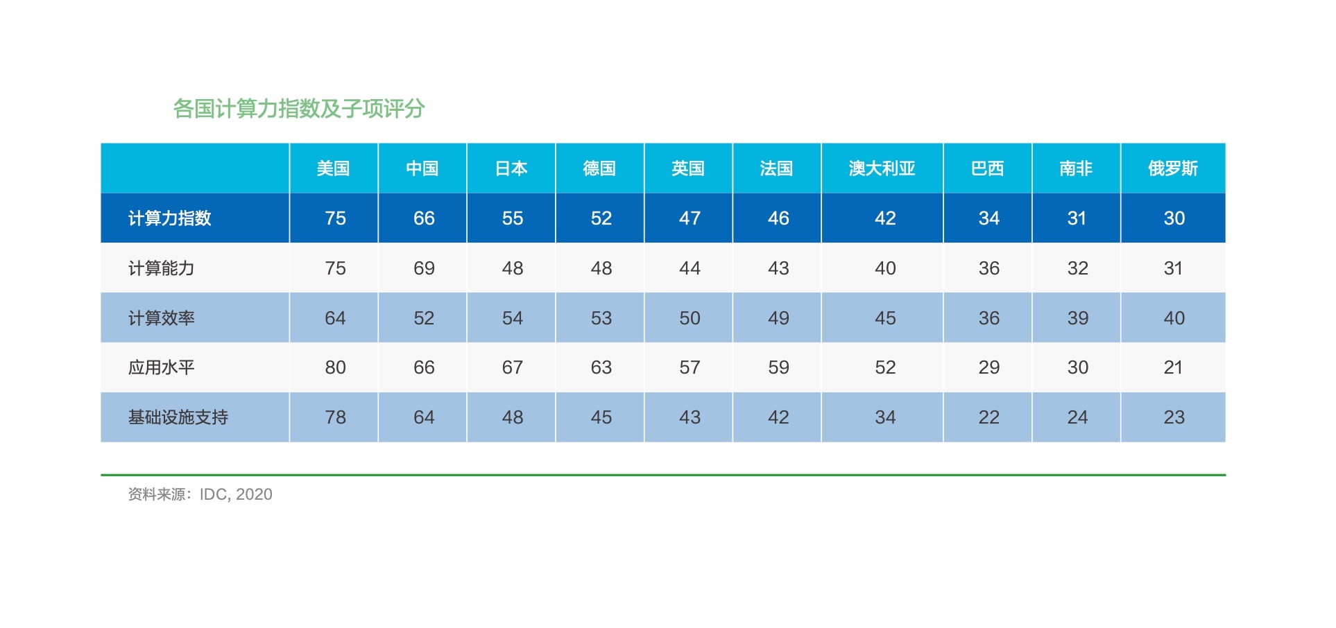 日前,浪潮信息联合全球知名科技市场研究机构国际数据公司(IDC)发布全球首个计算力指数的研究成果《2020全球计算力指数评估报告》,覆盖中国、美国、日本、德国、英国、法国、澳大利亚、巴西、俄罗斯和南非10个国家,从计算能力、计算效率、应用水平和基础设施支持4个维度对各国计算力水平进行全面评估。