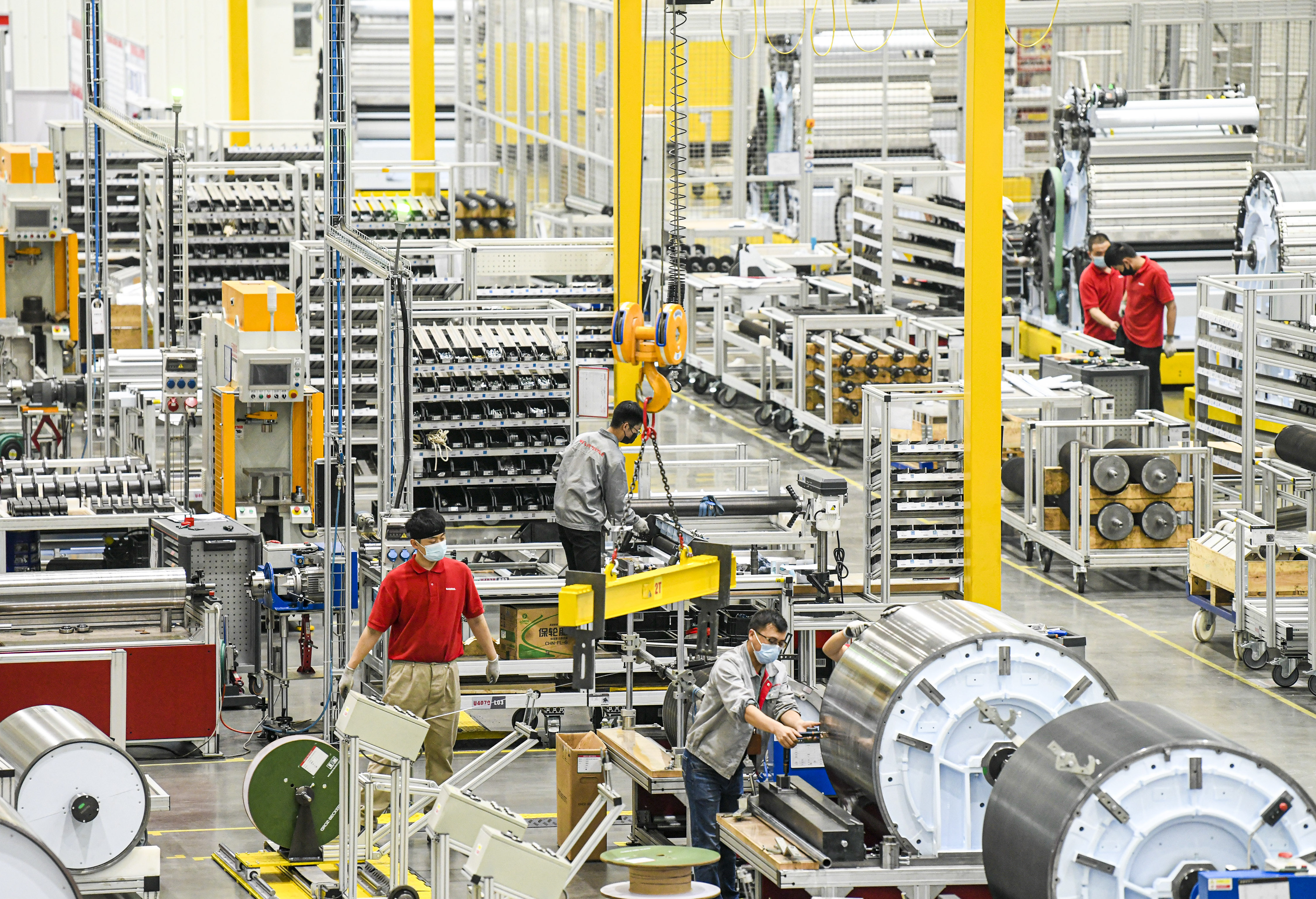 2020年10月22日,在卓郎新疆智能机械有限公司的智能工厂车间内,工人在生产线上作业。新华社记者 王菲 摄