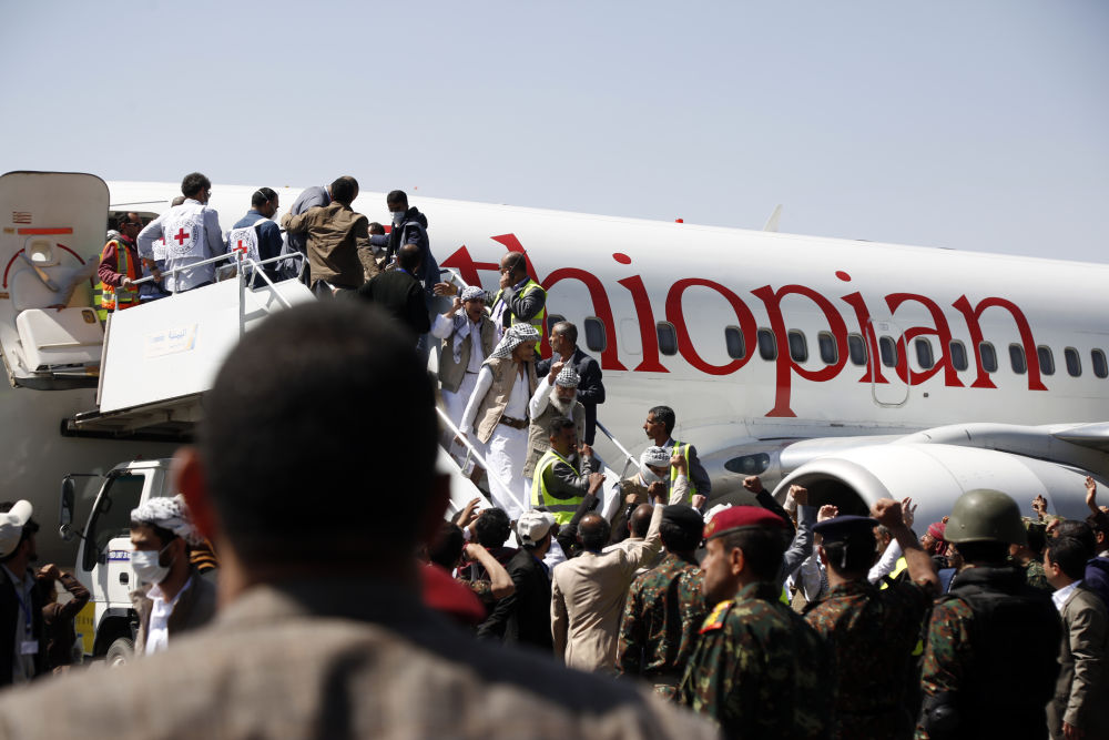 2020年10月15日,被释放的胡塞武装人员乘飞机抵达也门萨那。也门政府与胡塞武装当天开始大规模换俘行动,双方共计将释放1081名战俘。(新华社发,穆罕默德摄)