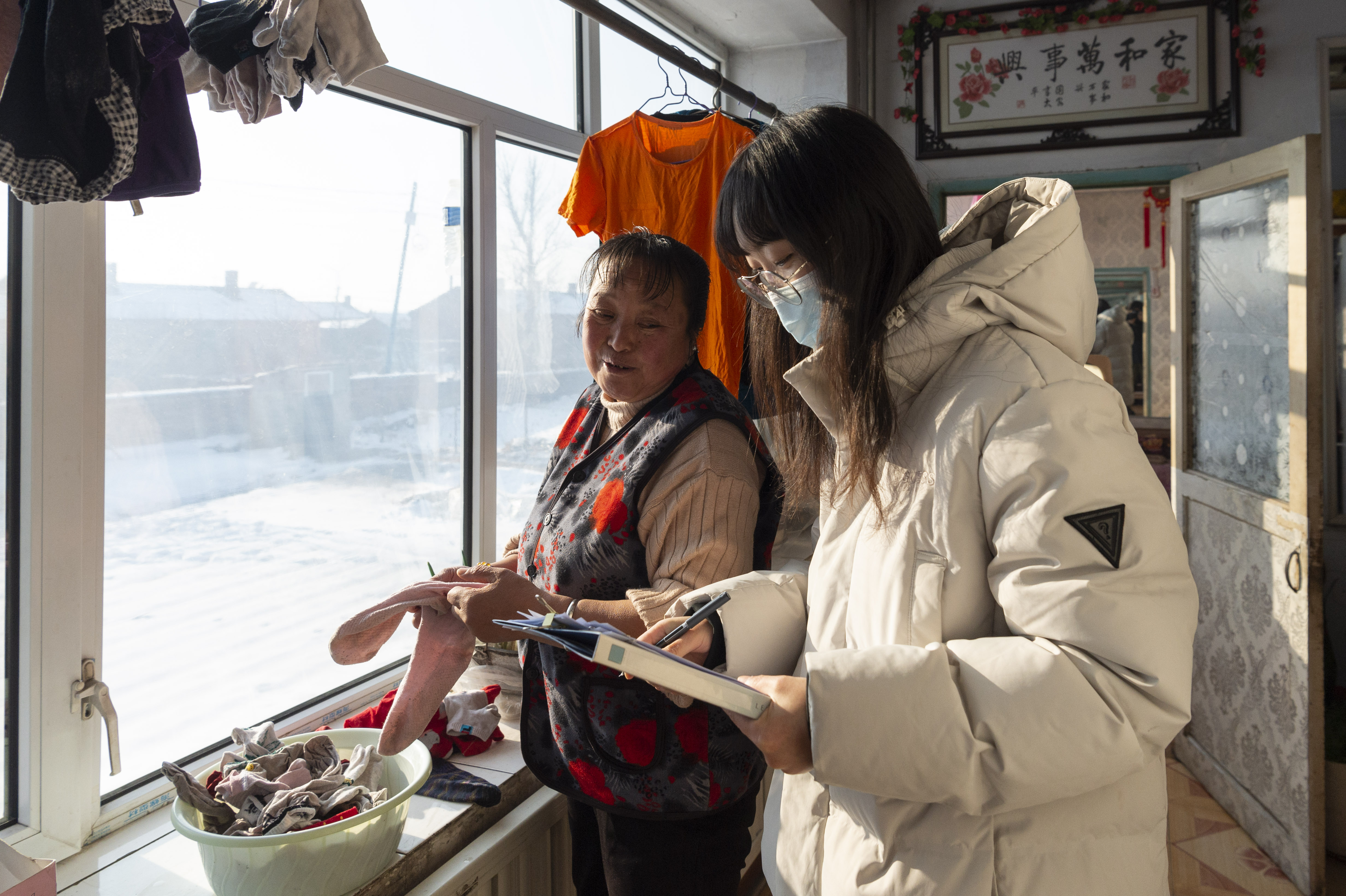 在桦川县苏家店镇集贤村,中国疾病预防控制中心环境与健康相关产品安全所的工作人员(右)对当地村民进行问卷调查。 新华社记者 谢剑飞 摄