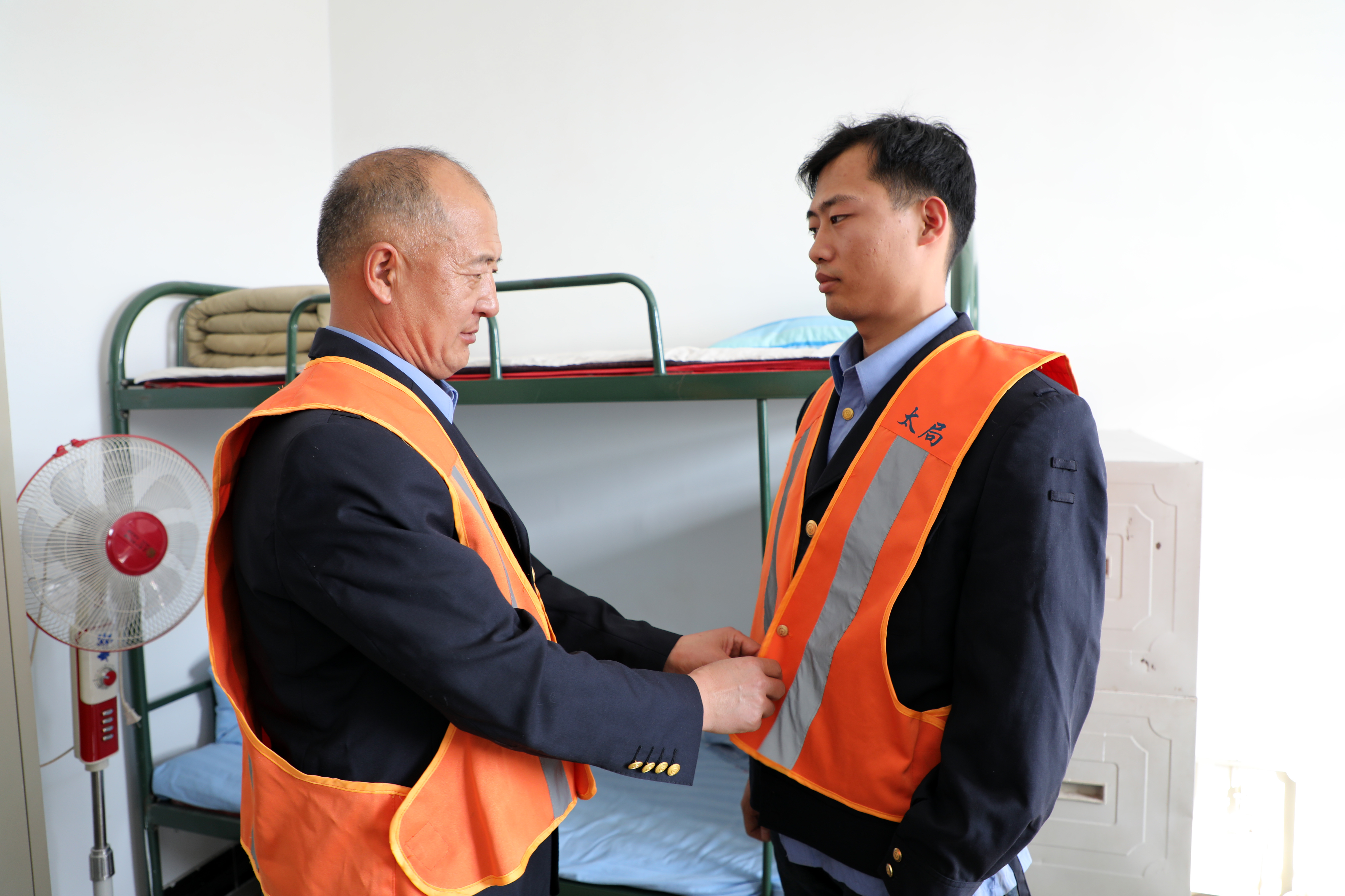 杨树勇为儿子整理着装,原平工务段段申雪摄