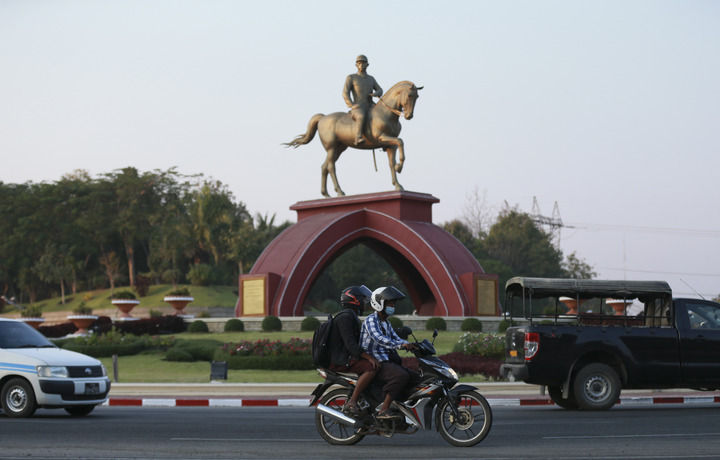 2月5日,市民骑摩托车经过缅甸首都内比都街头的一个十字路口。(新华社记者张东强摄)