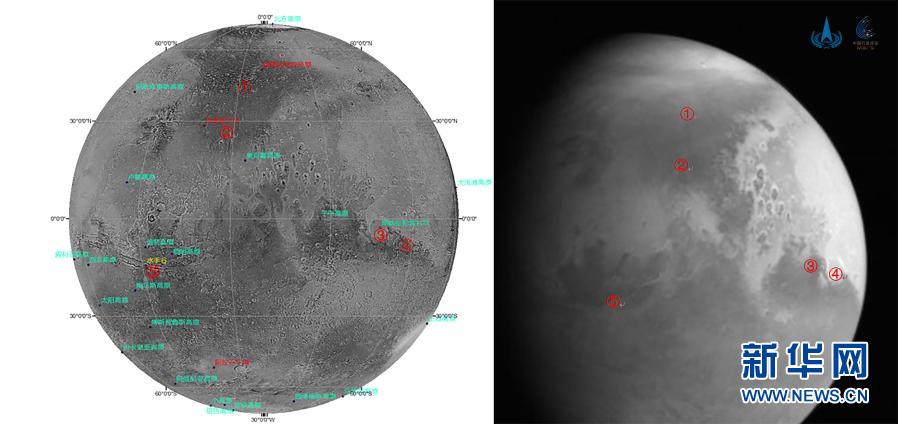 ▲这是国家航天局公布的“天问一号”在距离火星约220万公里处获取的首幅火星图像及火星部分标志性地貌标示。新华社发