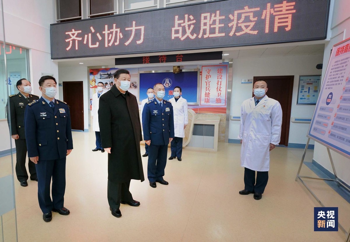 △中华民族传统节日春节即将来临之际,中共中央总书记、国家主席、中央军委主席习近平2月4日视察空军航空兵某师,看望慰问部队官兵,代表党中央和中央军委,向全体人民解放军指战员、武警部队官兵、军队文职人员、民兵预备役人员致以诚挚问候和新春祝福。这是习近平到场站医院了解部队疫情防控和支援地方防疫情况。