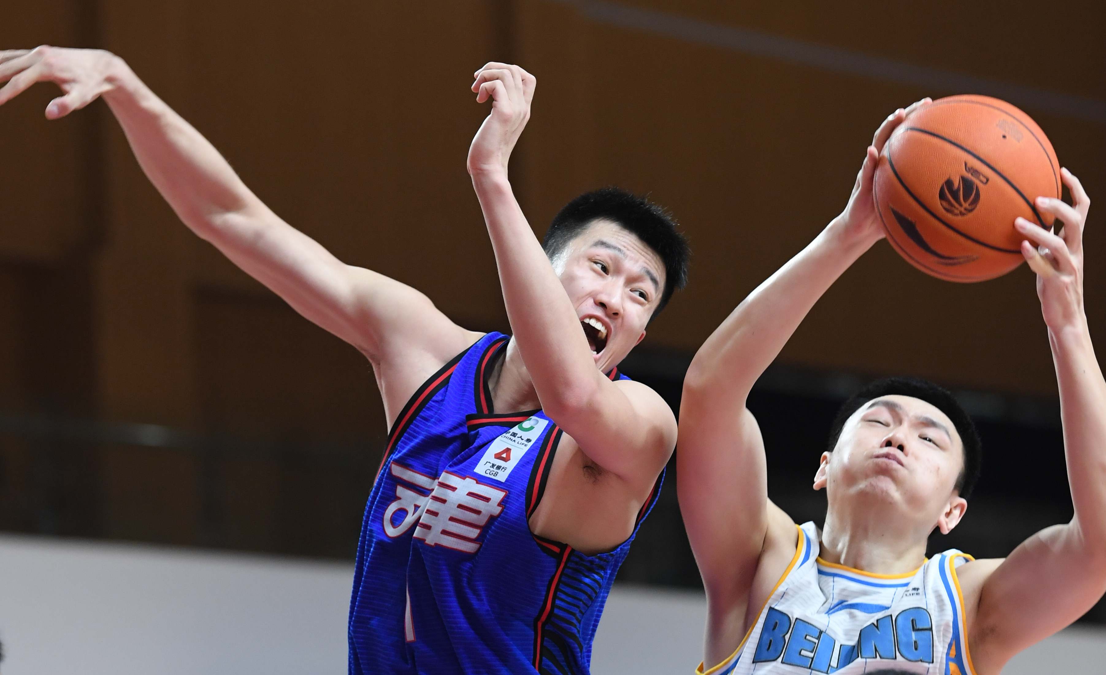 2月6日,天津先行者队球员孟子凯(左)和北京首钢队球员朱彦西拼抢篮板。新华社记者 翁忻旸 摄