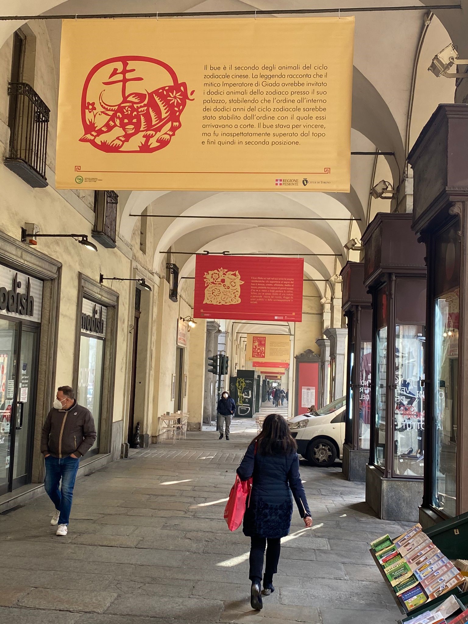 从2月5日至21日,都灵大学孔子学院在皮埃蒙特大区支持下,于都灵市著名的波河路两侧的拱廊内布置了主题横幅展览,精选春节诗歌及相关文学作品以中文和意大利译文呈现,旨在向市民展示春节传统文化习俗。(总台记者 邓宗宇)