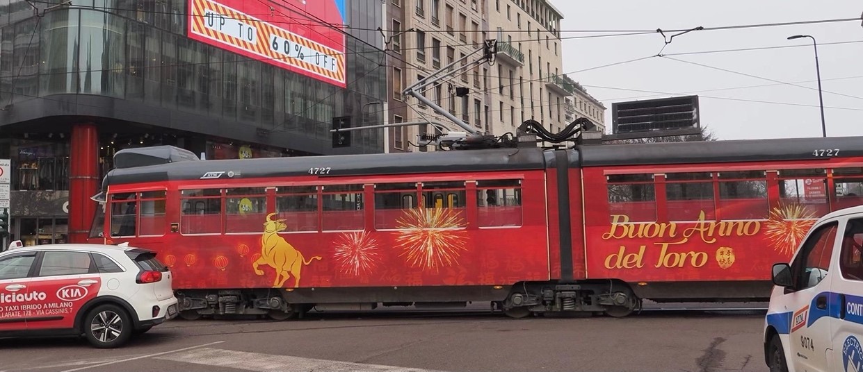 同时,从米兰市中心驶过的第4727号19路电车内外,也装点了牛年生肖及焰火图案,以及意大利语和中文的“牛年快乐”。