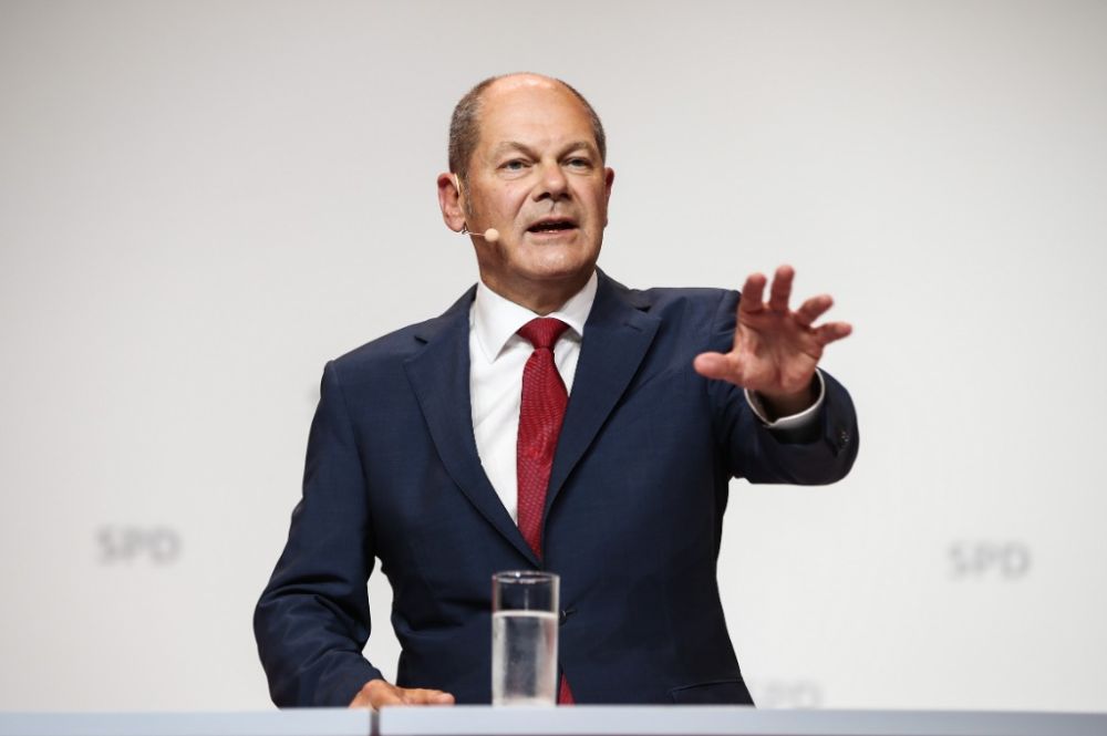 2020年8月10日,在德国首都柏林,德国财政部长肖尔茨出席新闻发布会。(新华社记者单宇琦摄)