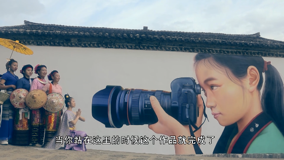“艺术改变乡村”发起人 信王军:拍照的隐喻实际上在这个时代,我们已经在一个开始不拒绝网红打卡的时代了,越来越多的人来到乡村,实际上是对乡村的帮助。然后它是一个指向标的概念,同时是跟来到这里的人的一个互动,就是我们留出了一个空白的墙面,当你站在这里的时候这个作品就完成了。