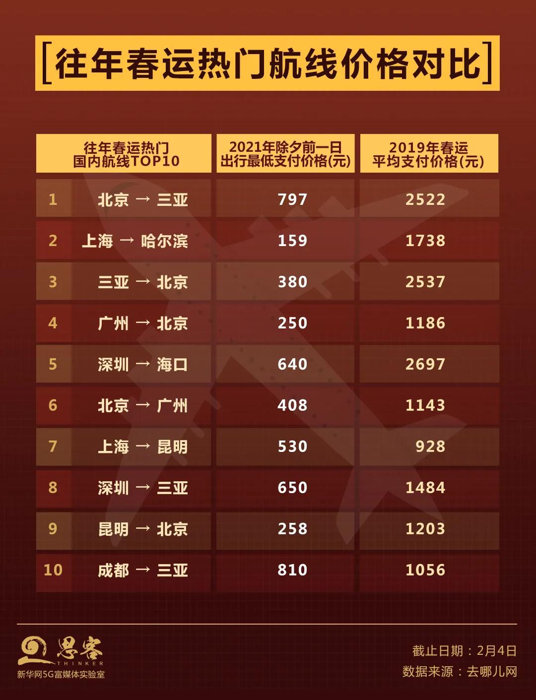 与“就地住酒店”相对应的,是热门航线机票价格的下降。去哪儿平台数据显示,2021年春运前机票预售平均支付价格创5年来最低,而且中国北方地区的春运热度低于南方地区。