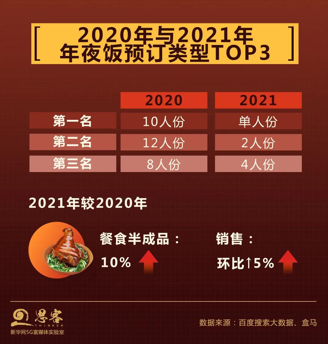 单人份年夜饭“受宠”。说到过年,少不了一餐充满仪式感的年夜饭。数据显示,北京、上海、浙江等劳务输入大省年夜饭预订量排名靠前,说明不少城市上班族调整了春节返乡计划,独自一人或是以小家庭为单位留在工作地过年。因此相比去年8-12人居多的年夜饭预订类型,今年4人份、2人份甚至单人份的年夜饭预订量较多。即使一个人过年,也要吃点好的!