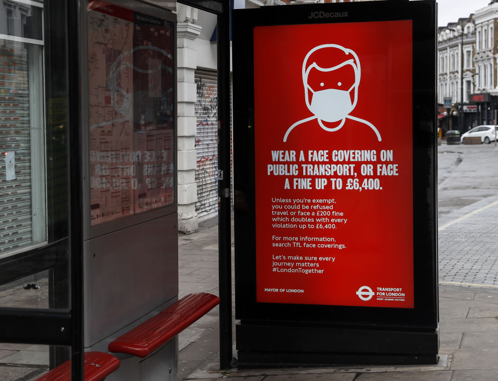 1月19日在英国伦敦一处公交车站拍摄的提示牌,它提醒乘客必须佩戴面部遮盖物。(新华社记者韩岩摄)