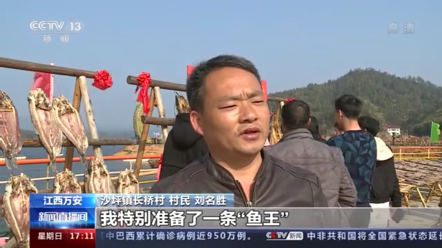 沙坪镇长桥村 村民 刘名胜:我特别准备了一条“鱼王”,给它戴上了头彩,来和乡亲们一起比一比,“晒”一“晒”,希望新的一年,年年有鱼,有个好彩头。