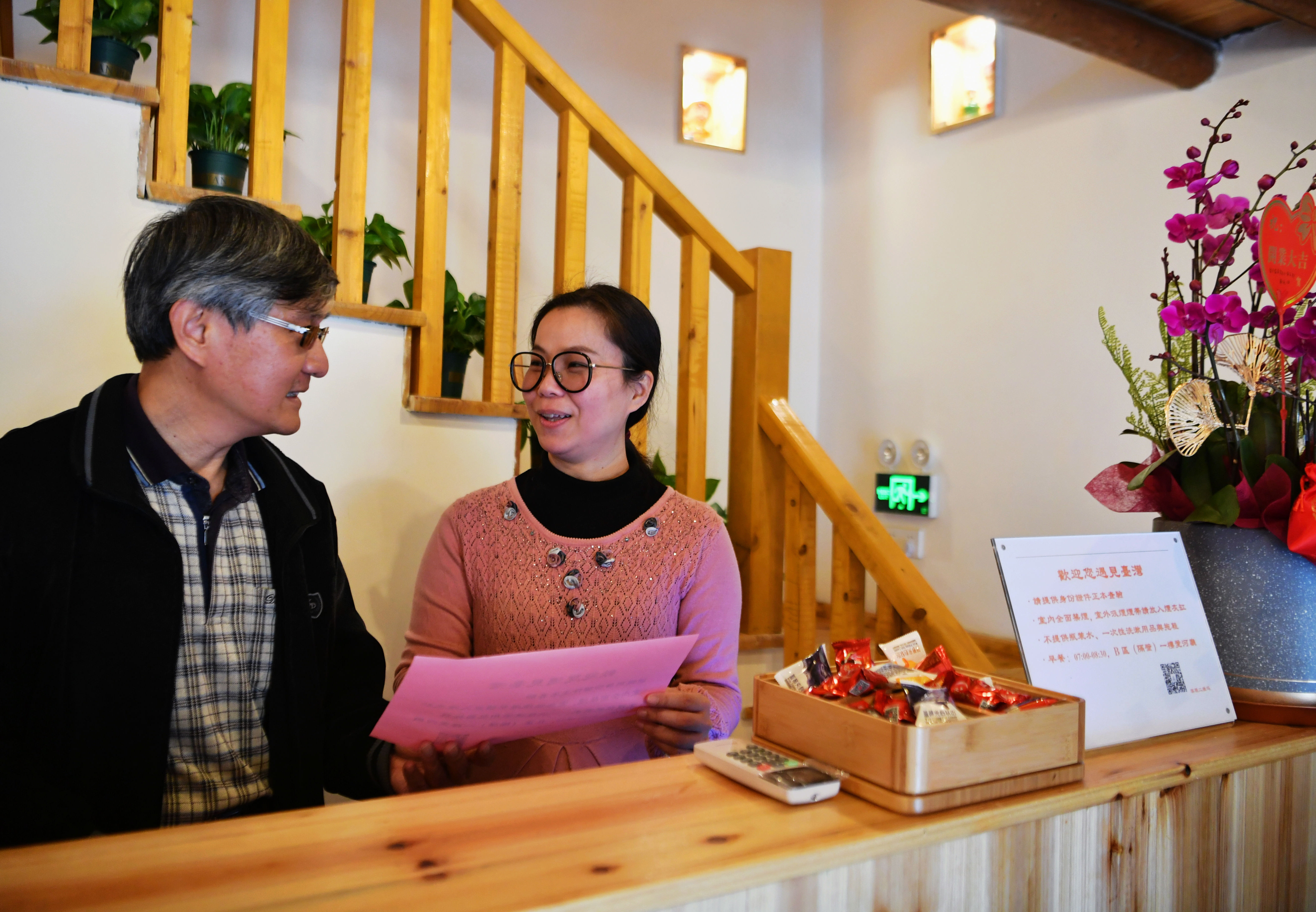 马彦彬和妻子林佳垔(右)在商量民宿开业的筹备工作(2月6日摄)。(新华社记者魏培全摄)