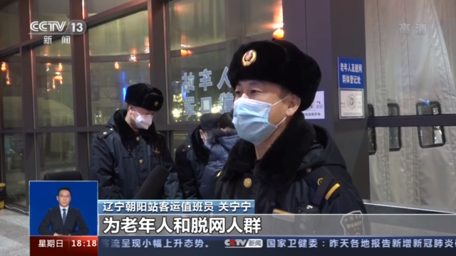 在辽宁朝阳站候车室,铁路工作人员正在帮助脱网老年人代扫“健康码”,进行身份证件登记、持纸质证明通行办理手续。