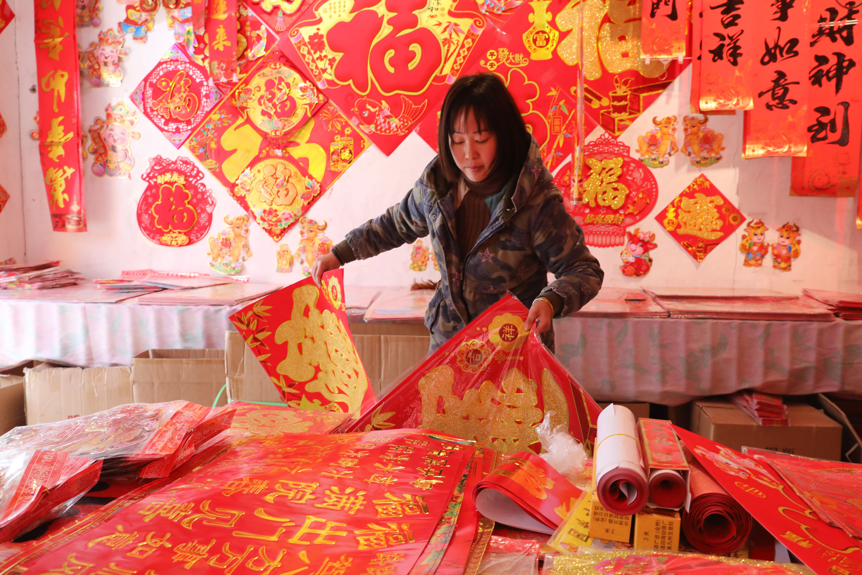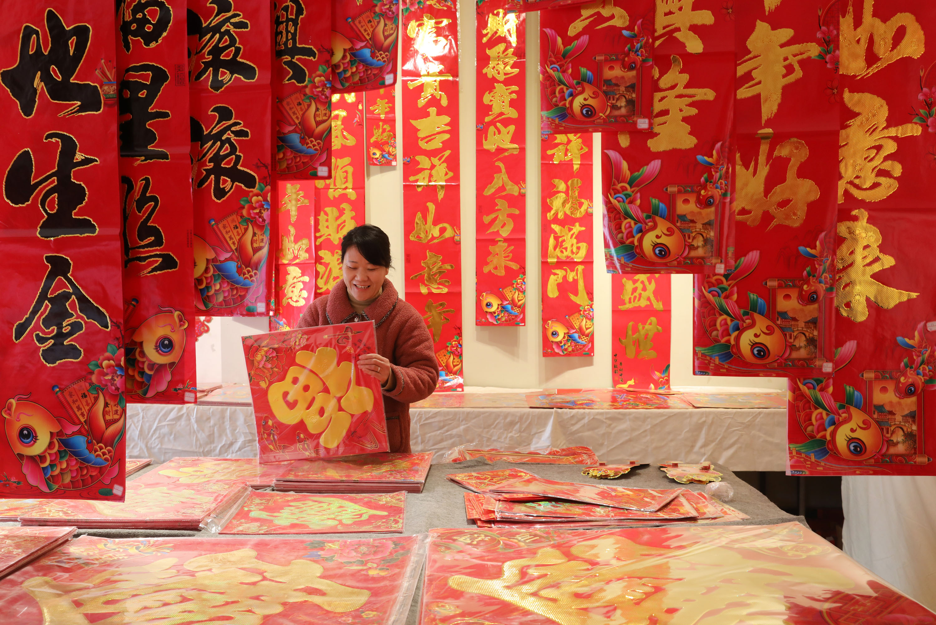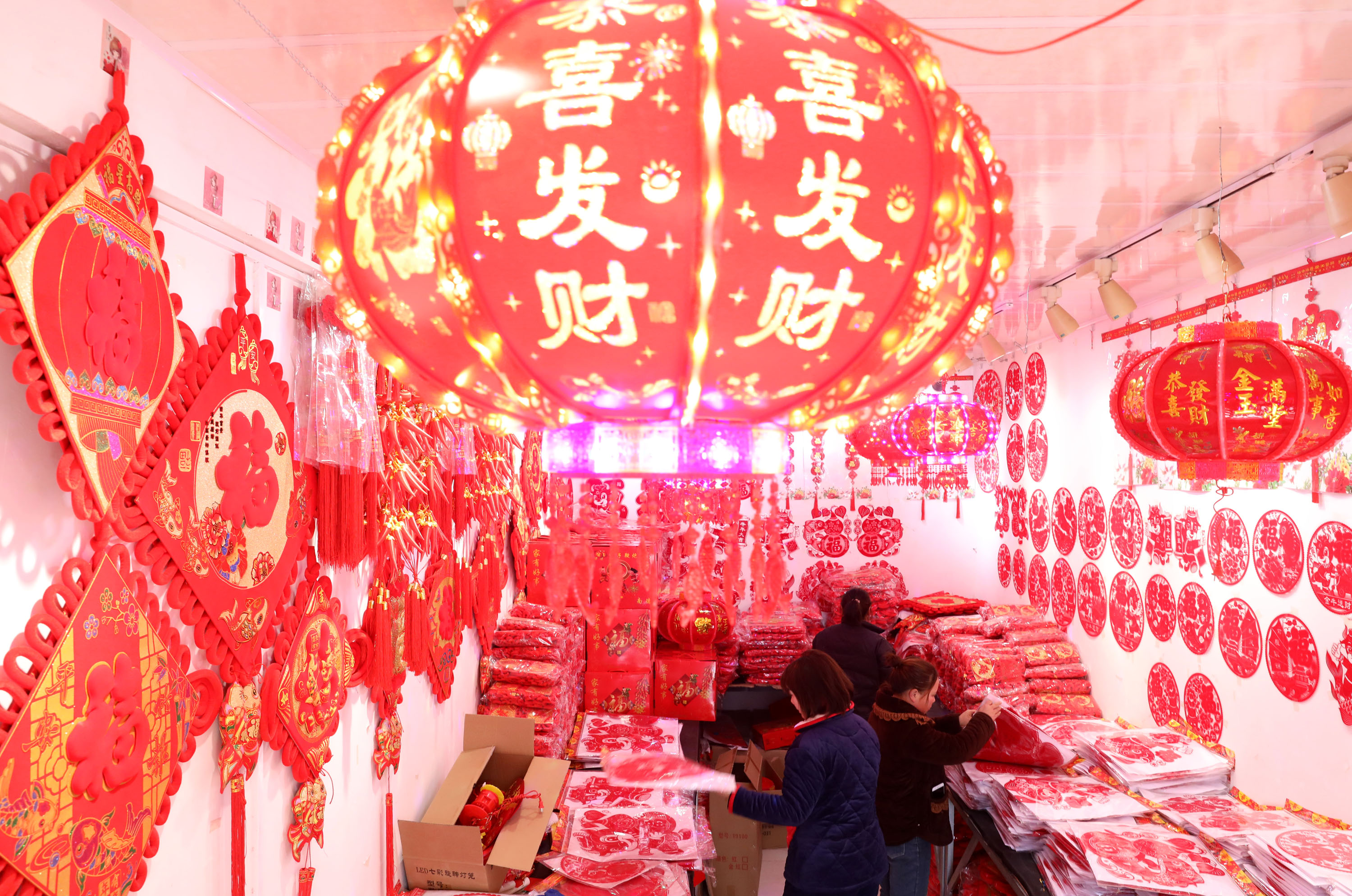 春节临近,河南省焦作市温县城乡年货市场上红火喜庆的灯笼、春联、窗花和中国结等饰物俏销,居民忙着置办年货,喜迎新春佳节。