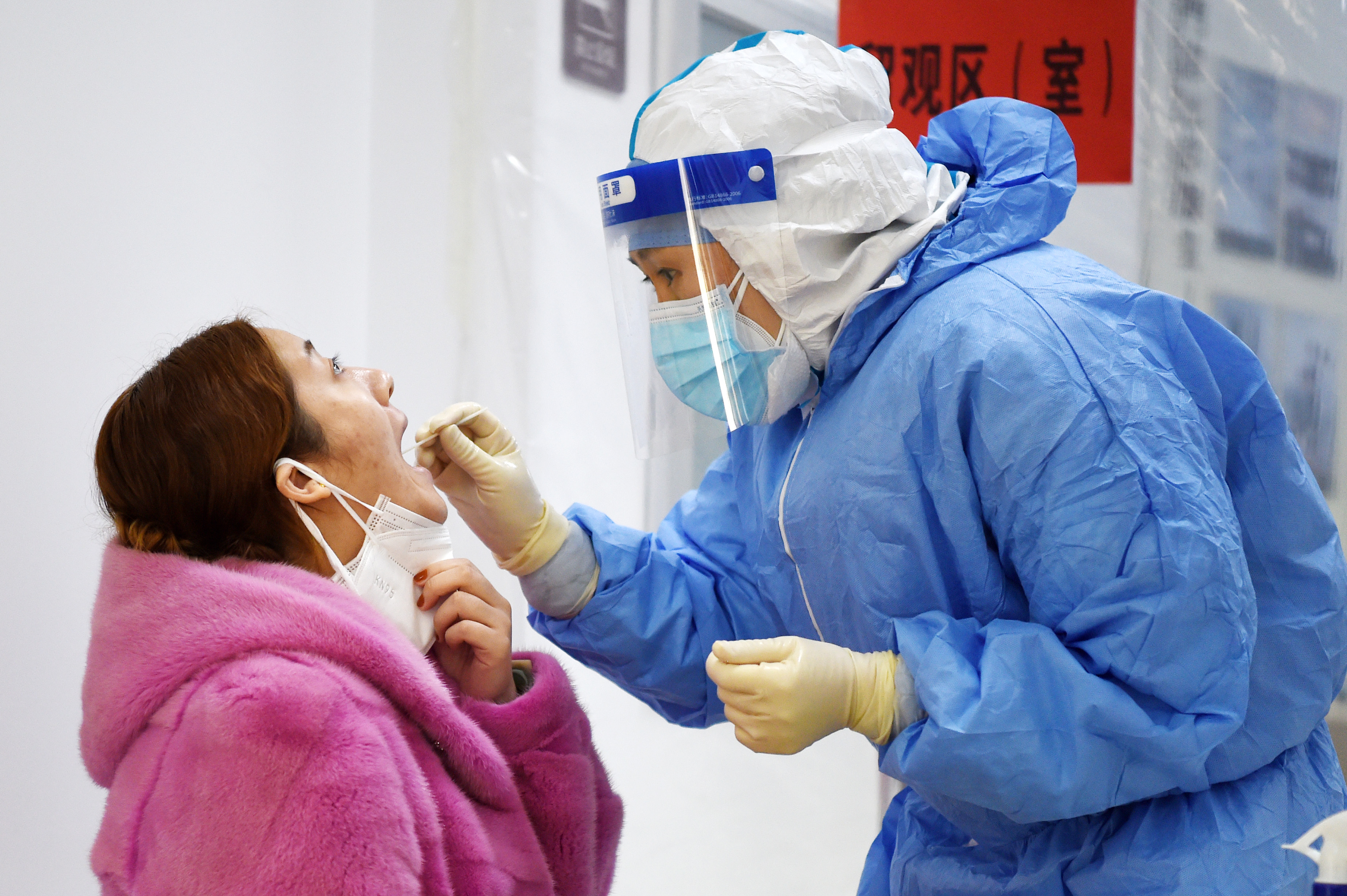 医务人员在哈尔滨市一处核酸检测点为市民采集核酸样本。