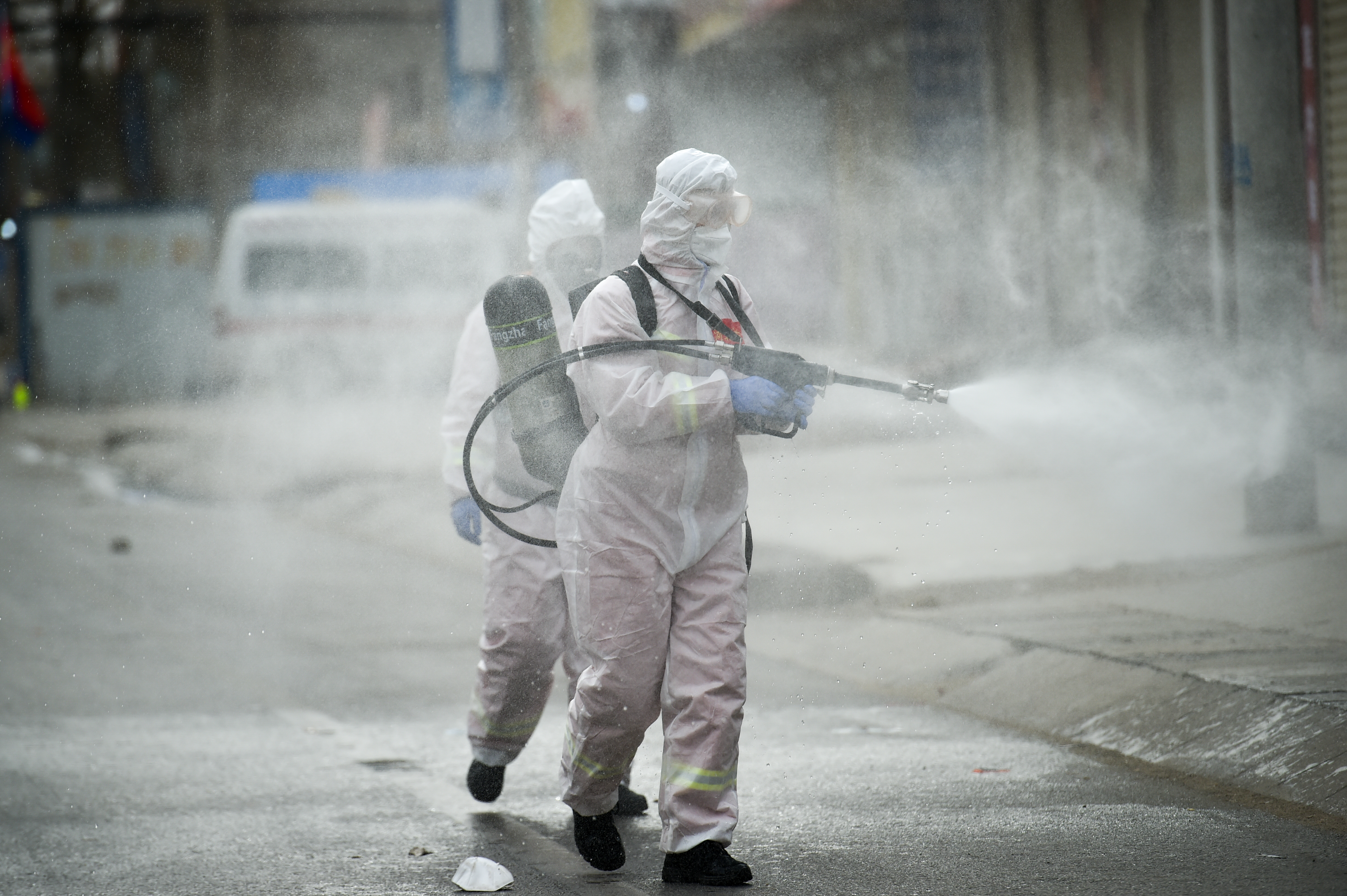 在河北省石家庄市藁城区,防疫工作人员在进行消杀。