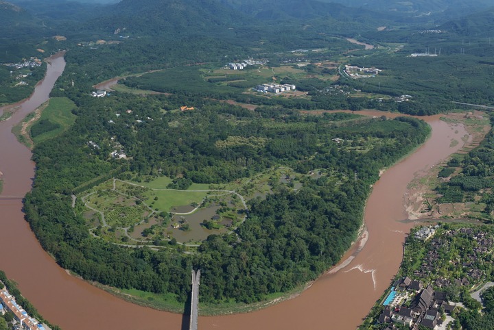罗梭江环绕的中科院西双版纳热带植物园。(西双版纳热带植物园提供)