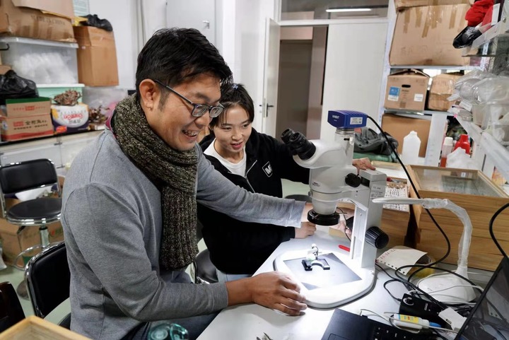 日本籍研究员中村彰宏在版纳园指导学生观察昆虫。(新华社记者孟佳摄)