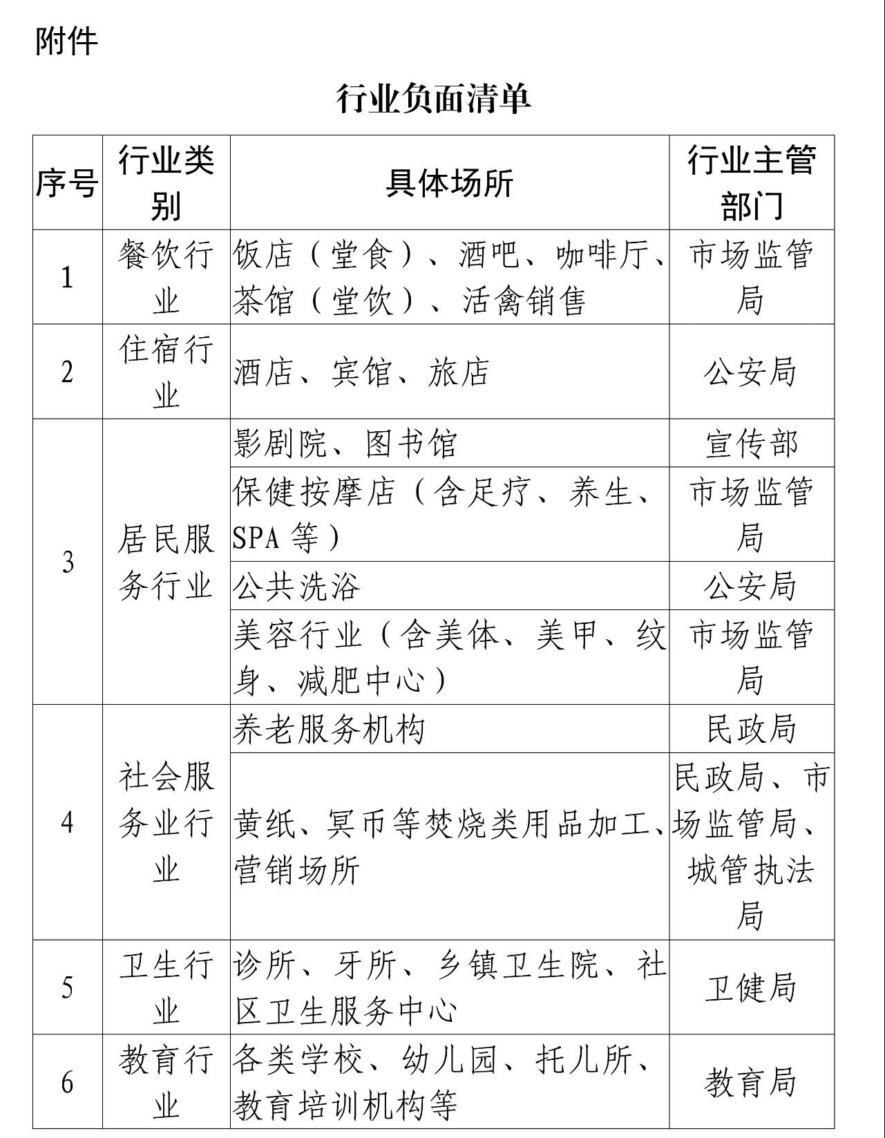 1.进一步放开经营场所。实行负面清单制度,对属于负面清单中的公共场所及经营行业,暂不开放。纳入负面清单的公共场所主要是指空间相对密闭、人员相对聚集、非生活必需的场所(负面清单附后)。