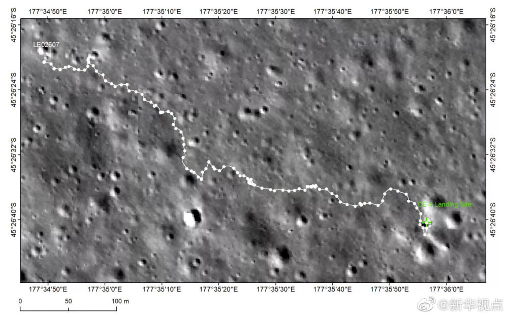 【嫦娥四号再度唤醒 进入第27月昼工作期】记者从国家航天局获悉,嫦娥四号着陆器和“玉兔二号”月球车分别于2月6日16时48分和4时26分结束月夜休眠,受光照自主唤醒,进入第27月昼工作期。“玉兔二号”月球车走到月面以来,累计行驶里程约628.5米,目前位于着陆点西北方向,距离着陆点直线距离约430米。(记者:胡喆 图片来源:国家航天局,绿点处为嫦娥四号着陆点)