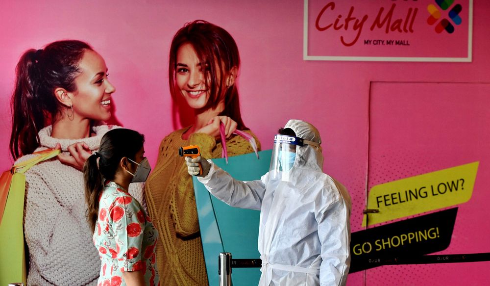 2020年6月9日,在印度大诺伊达地区,进入商场的人接受体温检测。(新华社发,帕塔·萨卡尔摄)