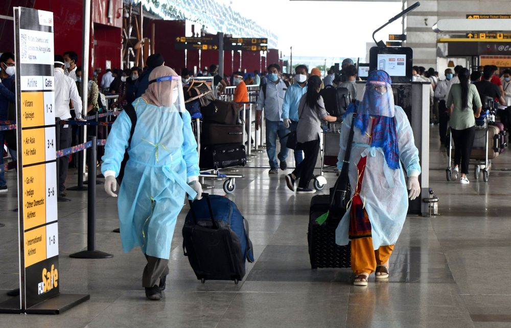 2020年5月25日,在印度新德里英迪拉·甘地国际机场,两名旅客穿戴着防护服和面罩出行。(新华社发,帕塔·萨卡尔摄)