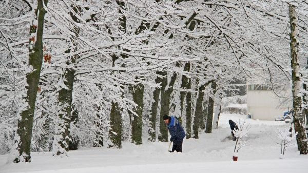 资料图片: 1月8日,在白俄罗斯首都明斯克,市政工人清扫公园道路上的积雪。(新华社)
