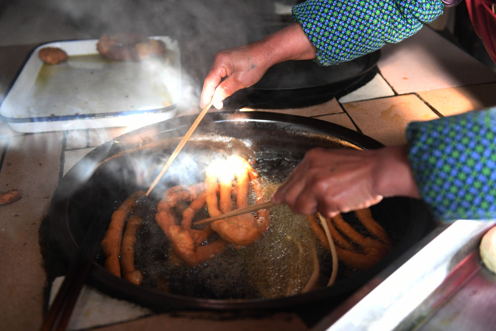 ↑2月5日,白崖村村民李延菊在炸制盘馓。新华社记者 张曼怡 摄