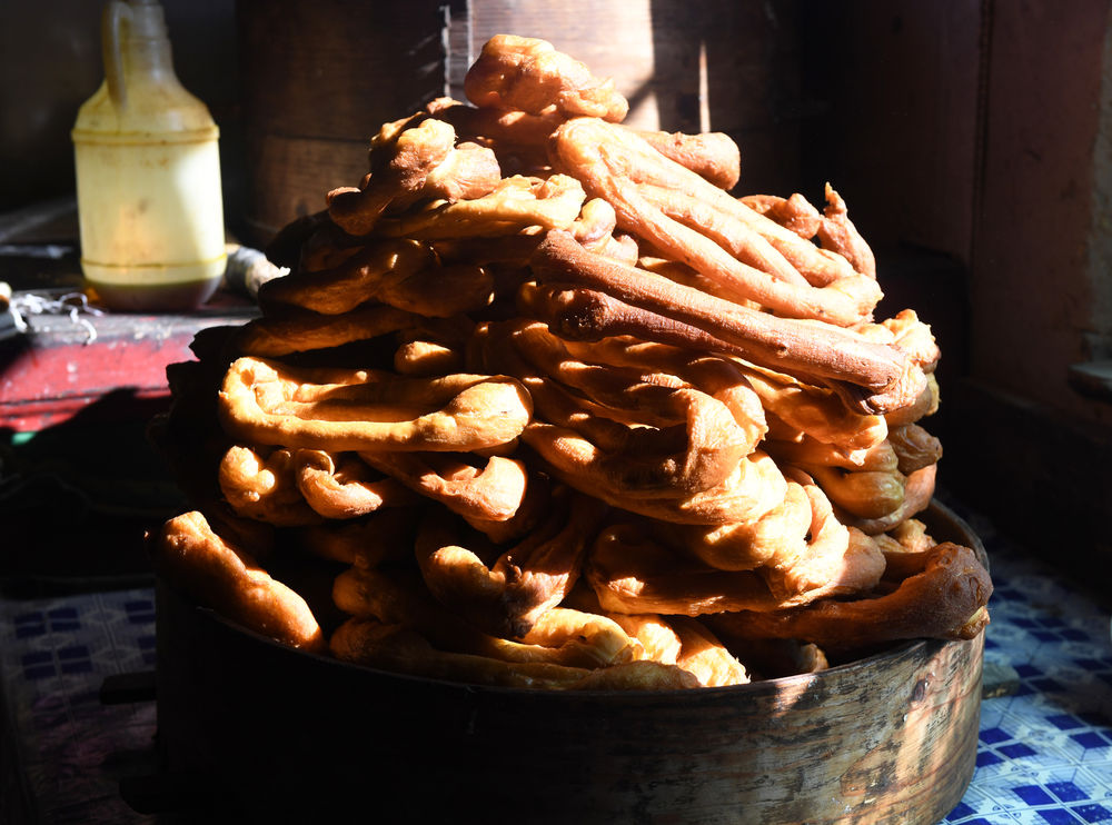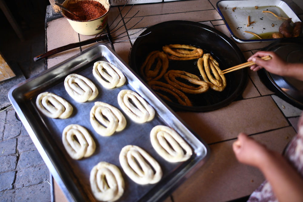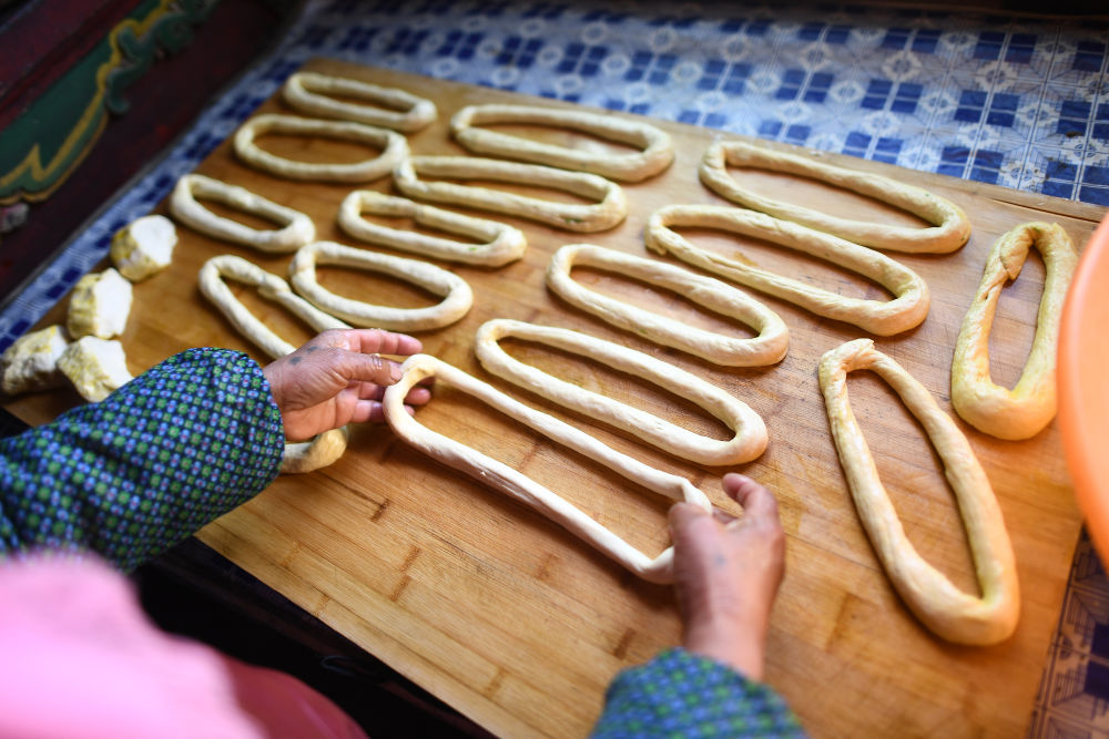 临近农历新年,青海省海东市互助土族自治县威远镇白崖村的村民们忙碌起来,家家户户开始制作盘馓。盘馓由发面定型炸制而成,是土族传统美食,也是土族家庭春节期间必不可少的美味。