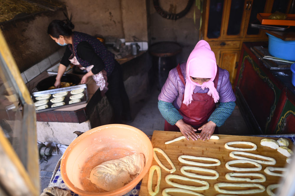 ↑2月5日,白崖村村民李延菊(右)在制作盘馓。新华社记者 张宏祥 摄