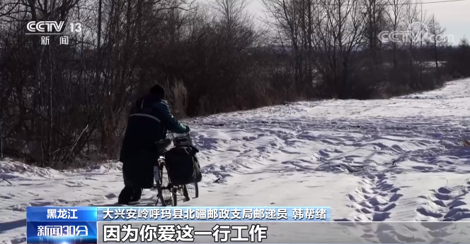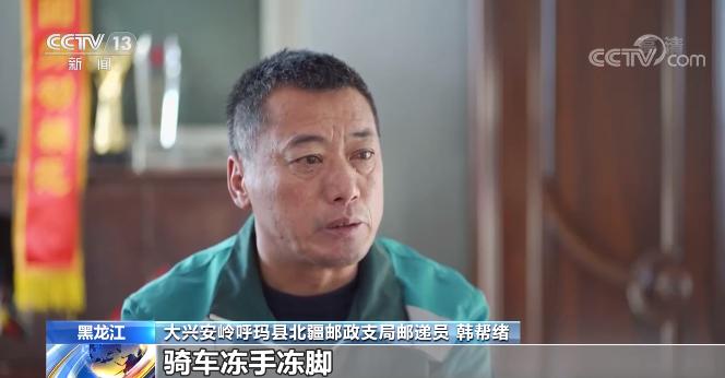 大兴安岭呼玛县北疆邮政支局邮递员 韩帮绪:一出门就打透了,浑身哇凉哇凉的。骑车冻手冻脚,我就推车子跑,跑热乎了再骑,骑了十多里地,浑身就冒汗了。后背就全是湿的,晚上回家后背就一层硬壳。